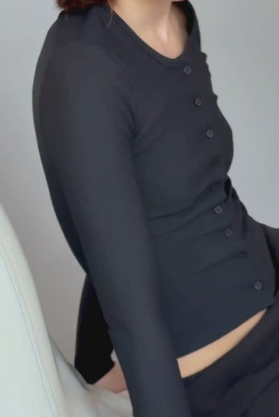 A long sleeve cardigan with button-closure and a scooped neckline. Made in Los Angeles from a high end thermal spandex which features just the right amount of stretch.