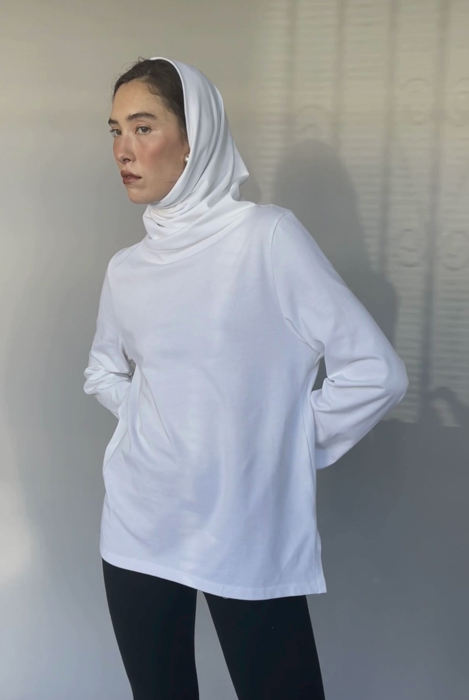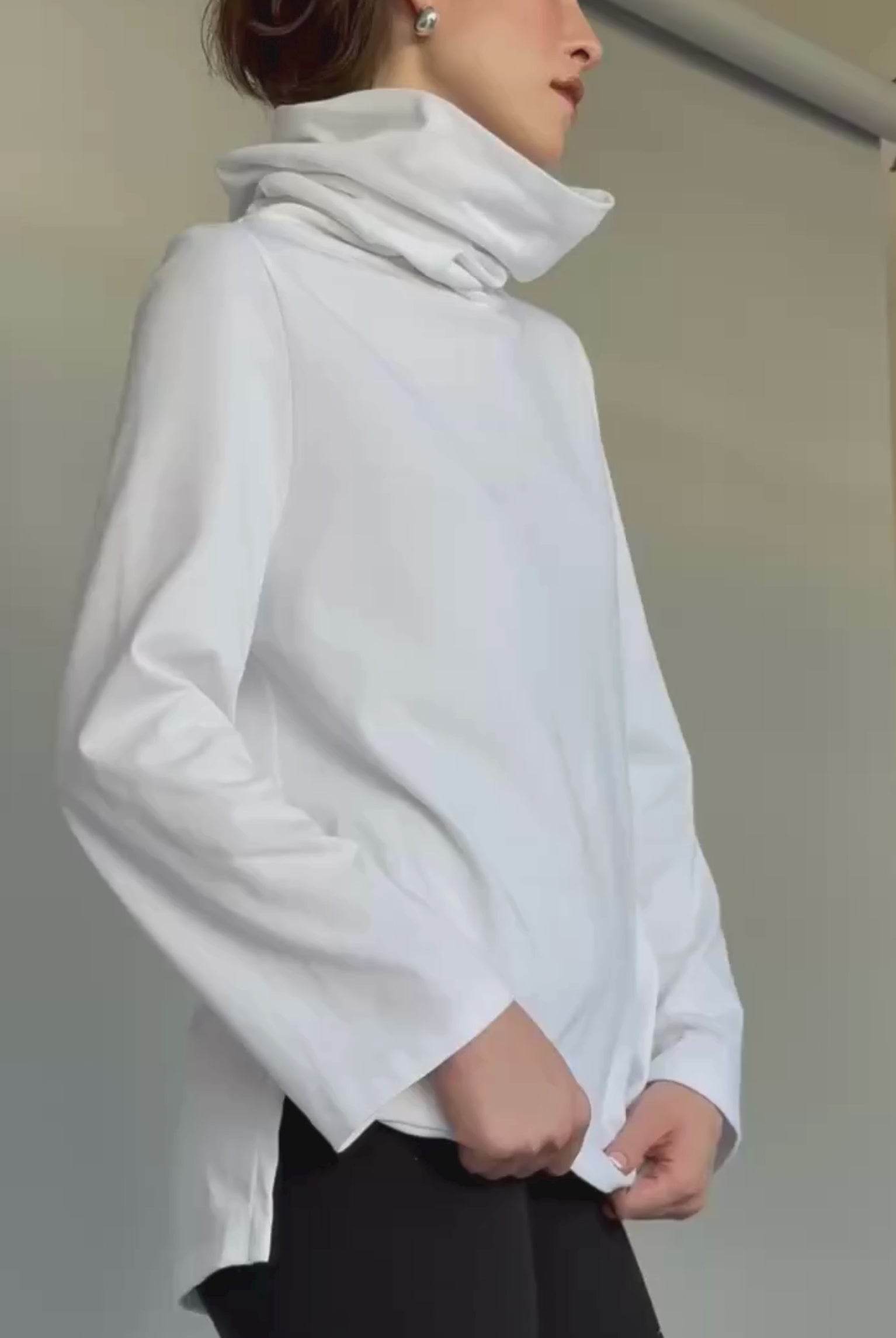 A loose-fitting long sleeve top with side vents and an oversized turtleneck that can also be worn as a hood. Inspired by a piece from Grace Kelly’s wardrobe, it’s both classic and bold—elegant yet comfortable.
